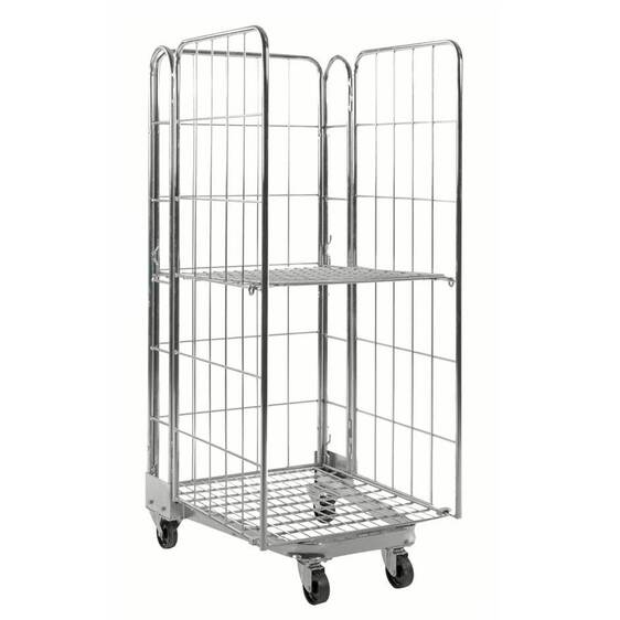 Rullecontainer Roger i galvanisert utførelse med 3 sider. Kan stables i hverandre (se produktbilde 2) og har 1 hylle som standard.